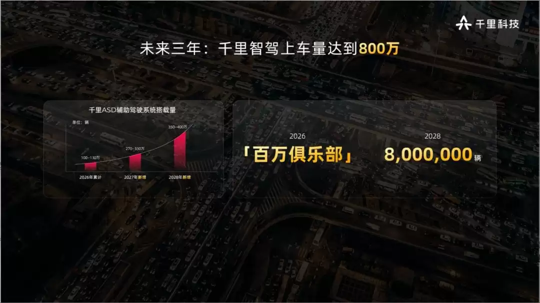 基于当前迅猛的增速,千里科技对未来做出了大胆预测:到2026年底,智驾搭载量将达到100万至130万辆;2027年,这个数字预计会攀升至270万至330万辆;而到了2028年,他们将挑战800万辆的里程碑。“如果我们实现800万台上车量,千里科技将成为全球智驾方案最大的供应商之一。”赵明表示。届时,智能辅助驾驶技术将近乎成为每台车的标配,出行安全水平有望得到大幅提升。