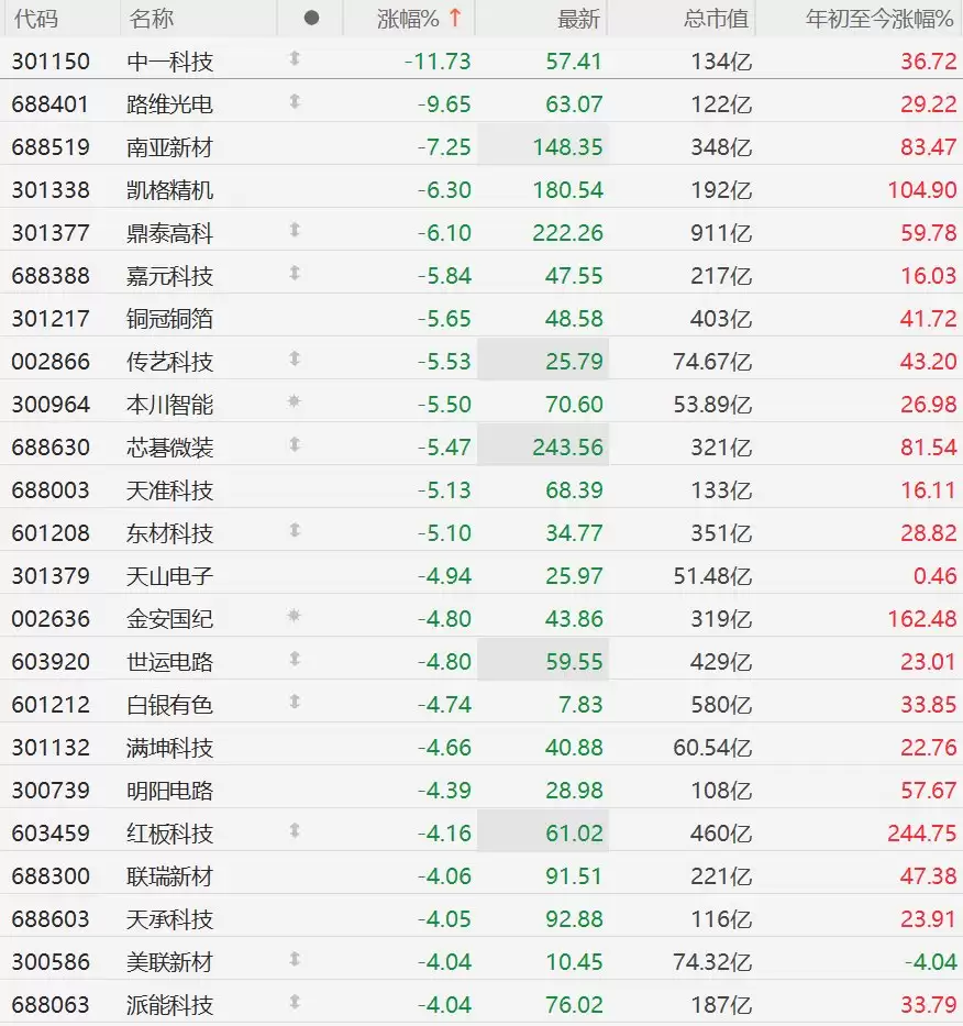 具体来看,中一科技跌幅超过11%,领跌板块。路维光电紧随其后,跌超9%。南亚新材的跌幅也超过了7%。此外,凯格精机、鼎泰高科均跌超6%。