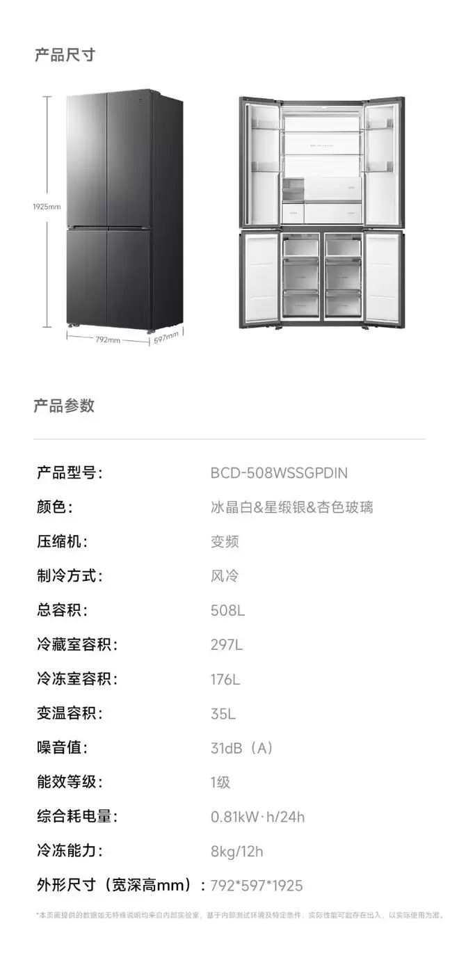 十字对开门结构优化了内部空间布局。具体分区为 297 升冷藏室、35 升宽幅变温室及 176 升冷冻室,总容积 508 升,充分满足多人口家庭的食材储鲜需求。其中,35 升变温室支持 -3℃ 至 4℃ 宽幅调温,无论是短期肉类保鲜、母婴食材存放,还是红酒储藏,都能提供精准的温度环境。