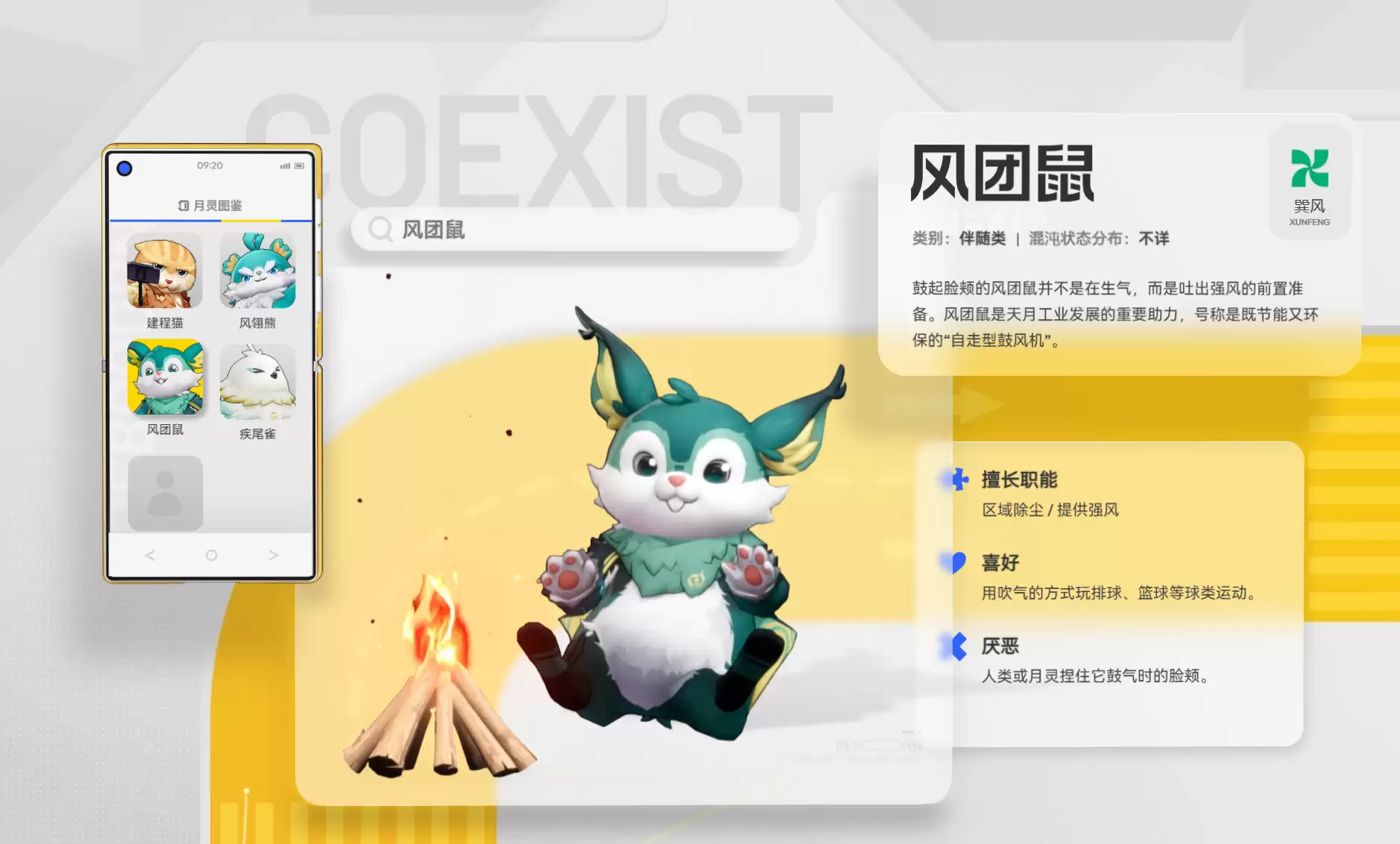 最后,风翎熊和风团鼠这对“风”系搭档也值得一说。虽然体型和习性迥异,但它们都与“风”结下了不解之缘。风翎熊外形酷似羽毛球,运动天赋出众,常以圆滚滚的形象担任比赛场务、运动陪练,甚至成为体育赛事的代言人。而风团鼠,则像一台自走型鼓风机,鼓起脸颊就能吐出强风,用于区域除尘和工业助力,是天月市工业发展的好伙伴。它喜欢用吹气的方式玩球,但有个禁忌:非常讨厌在鼓气时被触摸脸颊。玩家互动时,可得避开这个雷区。