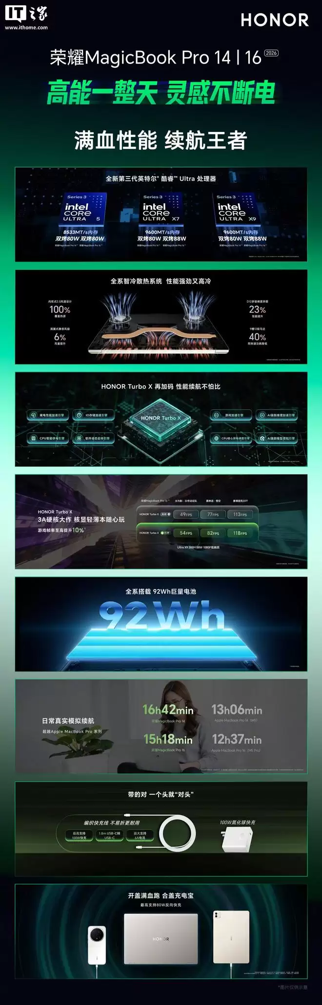 性能方面,这两款新品可谓诚意十足。它们均搭载了全新的第三代英特尔酷睿Ultra处理器,并支持荣耀自家的HONOR Turbo X性能调校技术,能充分释放硬件潜力。续航同样是亮点,全系配备了高达92Wh的大容量电池,官方宣称续航时间最长可达16.7小时。充电方案也很全面,支持100W氮化镓快充,甚至还能提供最高80W的反向快充,临时给手机或平板补电非常方便。