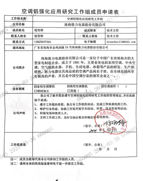图片内容是一份《空调铝强化应用研究工作组成员申请表》的扫描件,申请单位一栏赫然填写着“格力电器”。这张“历史旧照”的抛出,意图明确,旨在质疑格力在“铝代铜”技术路线上并非完全置身事外。
