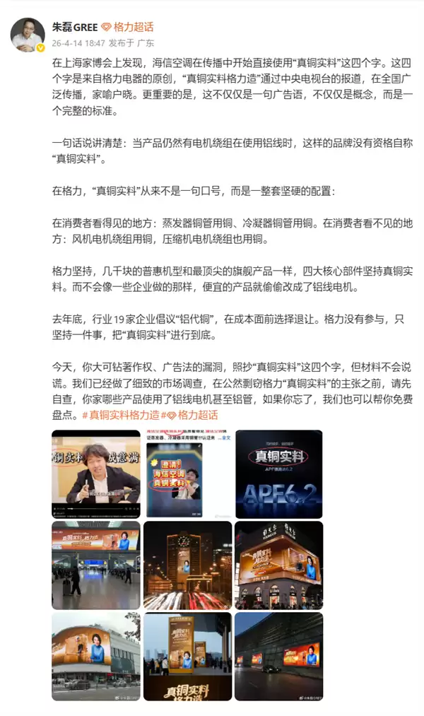 4月15日,一场由品牌口号引发的隔空喊话,再次将空调行业的“铜铝之争”置于聚光灯下。事件始于14日晚,格力电器CMO朱磊在微博公开发声,矛头直指海信空调。他指出,海信在传播中直接使用的“真铜实料”表述,实为格力的原创口号。