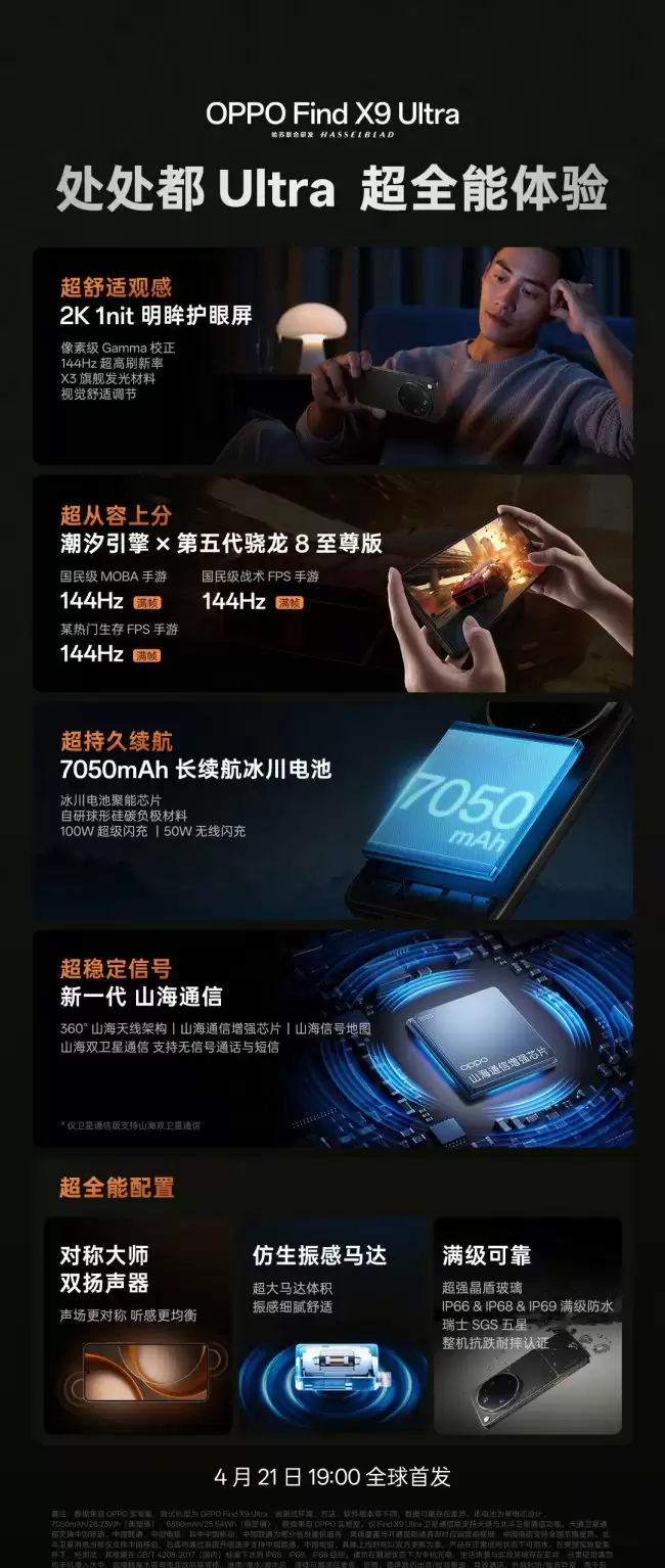 从已公布的信息来看,OPPO Find X9 Ultra在屏幕、性能、续航、通信乃至防护等基础体验维度上,都展现出了瞄准顶级旗舰定位的产品力。剩下的悬念,或许就等4月21日的发布会来全面揭晓了。