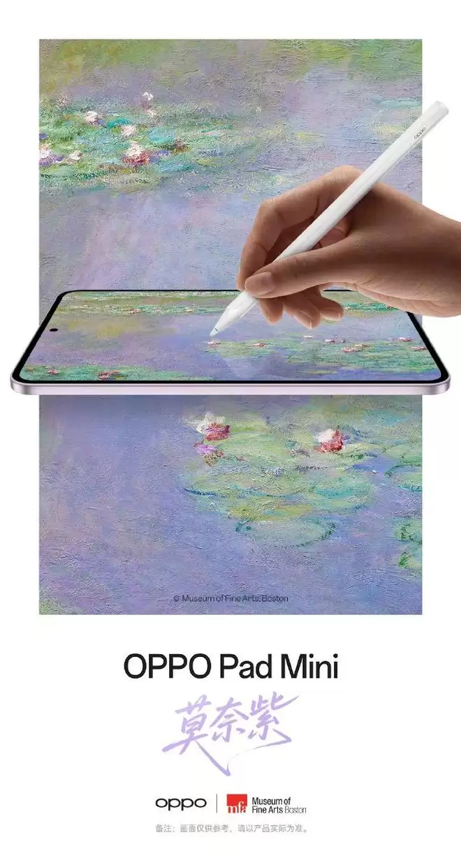 OPPO Pad Mini提供莫奈紫、薄荷青与深空灰三种配色,其设计语言强调清新治愈与简约百搭。其中,莫奈紫配色尤为特别,它是OPPO与波士顿美术博物馆的联名作品,其色彩灵感直接提取自莫奈经典画作中的标志性紫色光影,赋予了这款平板独特的艺术气质。
