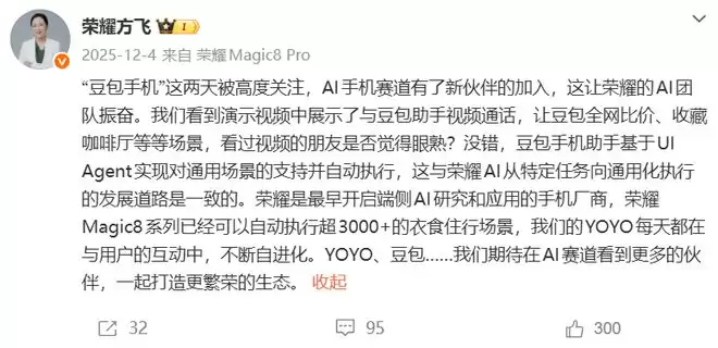 一个关键信号出现在2025年12月。荣耀产品线总裁方飞在社交媒体公开表达了对豆包手机技术路线的认可。她指出,豆包手机助手基于UI Agent实现的通用场景支持与自动化任务执行,与荣耀AI从特定任务向通用智能体演进的发展路径高度契合。