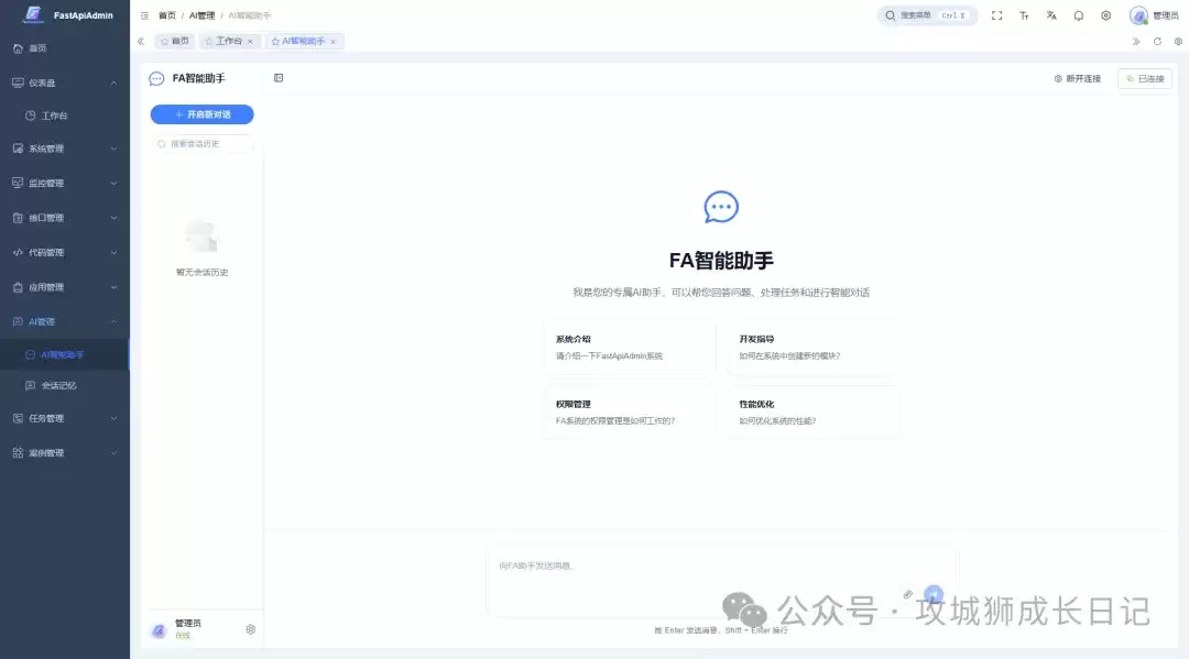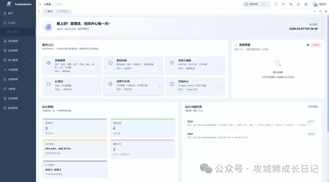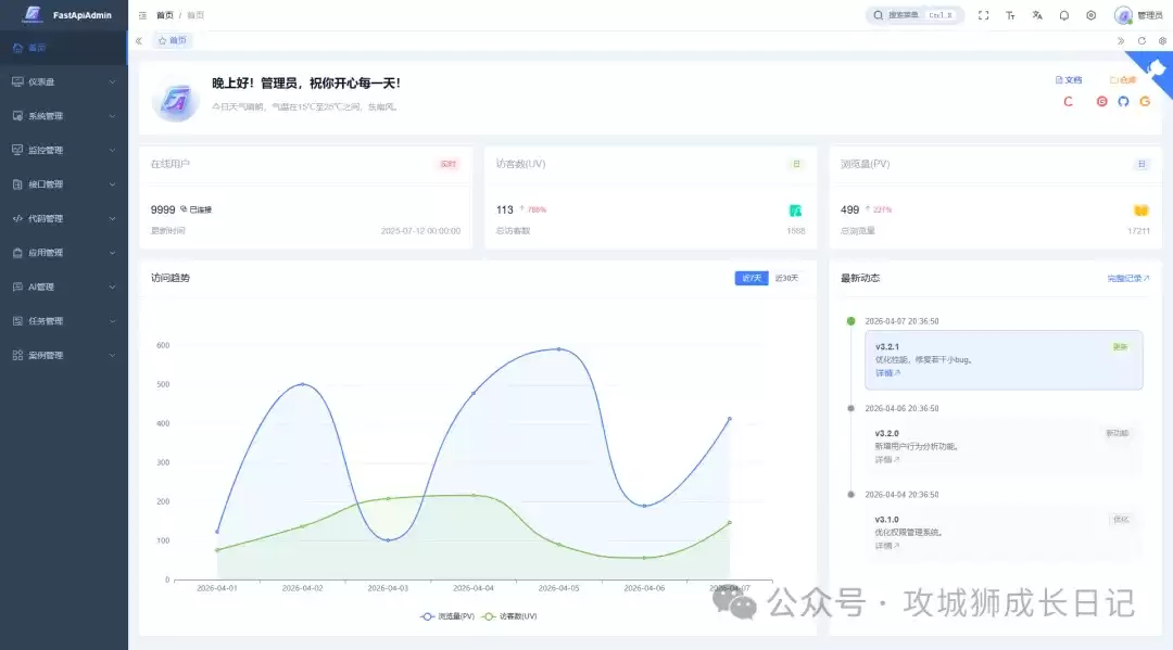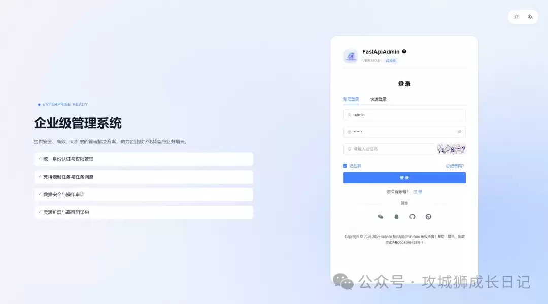 FastAPI Admin是一个开源、高度模块化的快速开发平台,旨在帮助开发者高效构建符合企业级标准的中后台应用。它深度整合了后端的FastAPI框架与前端的Vue3技术栈,提供了前后端分离、多终端适配的一体化开发方案。无论你的经验水平如何,都能立即获得一个功能齐全、可投入生产的后台系统。