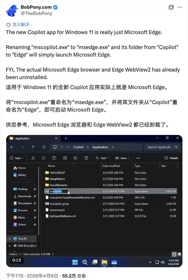 操作过程毫无技术门槛:找到 Copilot 的安装文件夹,把里面的“mscopilot.exe”重命名为“msedge.exe”,再把文件夹名从“Copilot”改成“Edge”。完成这两步后,双击这个“冒牌货”,一个货真价实的 Microsoft Edge 浏览器窗口就弹了出来。