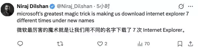 有网友用经典的微软梗调侃道:“微软最厉害的魔术,就是让我们用不同的名字,下载了 7 次 Internet Explorer。”