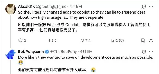 这操作立刻引发了群嘲:有人调侃,微软是不是打算“直接把 Edge 改名叫 Copilot,然后就能向股东吹嘘 AI 使用率有多高了”?看来,为了在 AI 赛道上刷存在感,微软真是有点“走投无路”了。