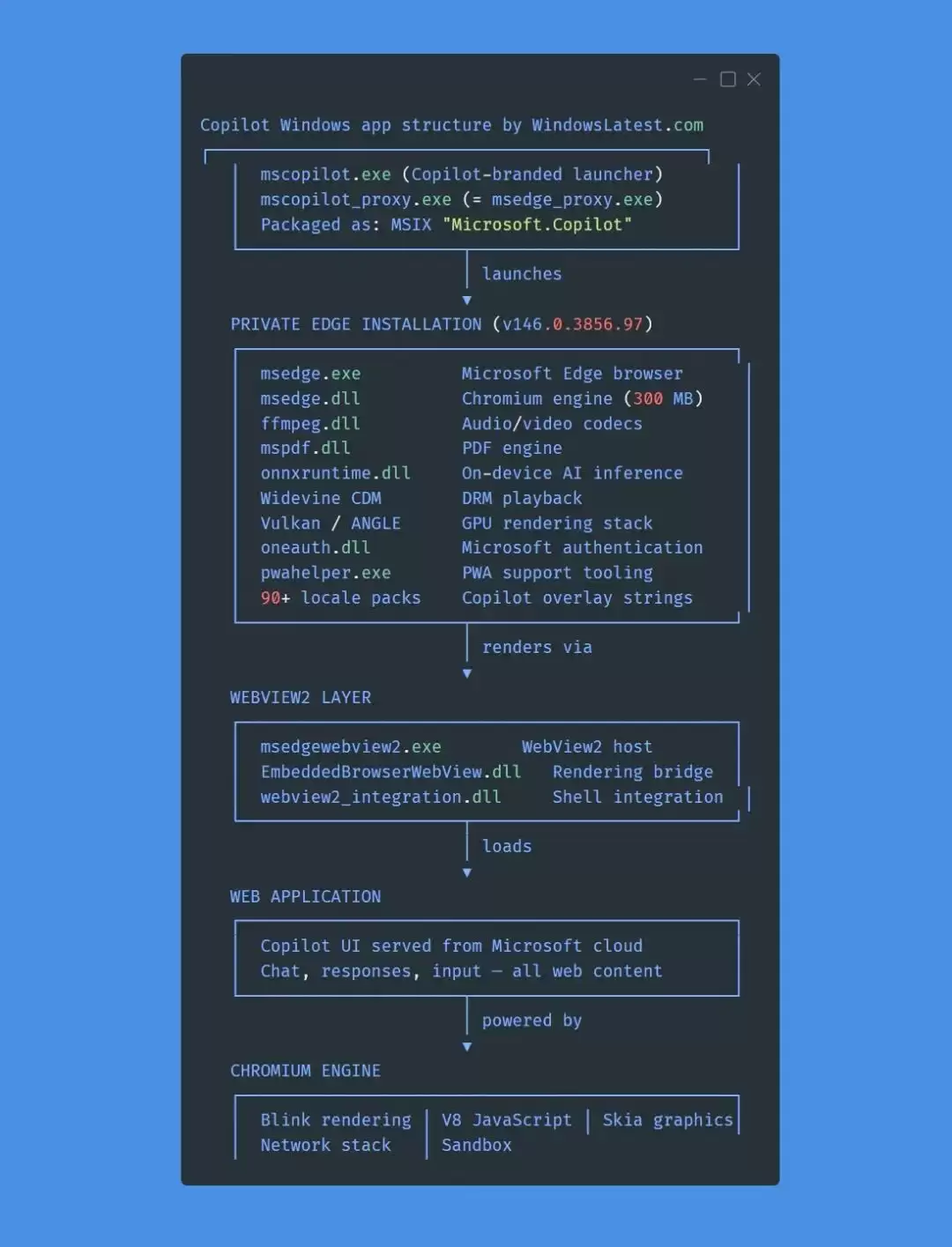 Windows Latest 的拆解还发现了更确凿的证据。在 Copilot 的安装目录里,躺着一个版本号为 146.0.3856.97 的专属文件夹,里面正是完整的 Microsoft Edge 安装包,体积高达 850MB。Edge 的核心二进制文件一个不少:msedge.exe、msedge.dll、msedge_elf.dll、ffmpeg.dll、libGLESv2.dll,甚至 Vulkan/SwiftShader、WidevineCDM 等组件也一应俱全。