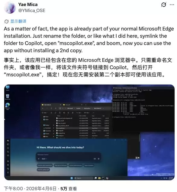 另一位网友 Yae Mica 的发现则从另一个角度印证了这一点。他指出,反向操作同样成立:“事实上,这个应用本身就是你正常安装的 Microsoft Edge 的一部分。你只需要重命名文件夹,或者像我一样,给 Copilot 文件夹创建一个符号链接,然后打开‘mscopilot.exe’,就能直接运行,根本不需要安装第二份副本。”