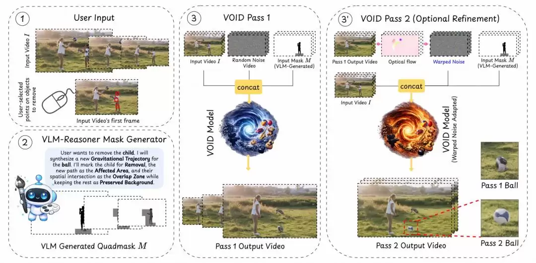 VOID的目标很明确:不仅要移除指定目标,还得对其消失后可能引发的物理连锁反应,进行合理建模与生成。框架的基石是三大核心创新:利用物理仿真引擎构建反事实数据集、引入交互感知的“四值掩码”作为条件化策略,以及在推理时借助视觉-语言模型自动识别哪些区域会受影响。