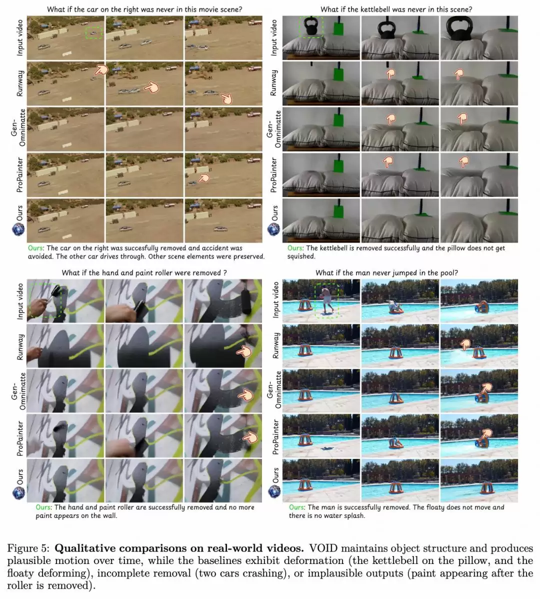 定性对比: 在众多真实场景案例中,基线方法暴露出各种不足:在碰撞场景中未能正确移除物体、重物移走后枕头依然保持凹陷、移除油漆滚筒后墙上却出现了新油漆等。反观VOID,在所有测试案例中都表现出了正确的物理推理。