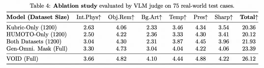 在除LPIPS之外的所有评估指标上,VOID均取得了最佳成绩。这里有个有趣的细节:LPIPS指标对局部像素位移非常敏感。这意味着,如果模型正确模拟了物体掉落,但下落速度与“标准答案”有细微偏差,其得分反而可能低于那些简单删除物体、导致物理错误的模型。而在更能衡量整体质量的视频级指标(如FVD)和VLM裁判分数上,VOID与基线模型的差距最为显著,这强有力地证明了其在物理合理性与语义一致性方面的卓越优势。