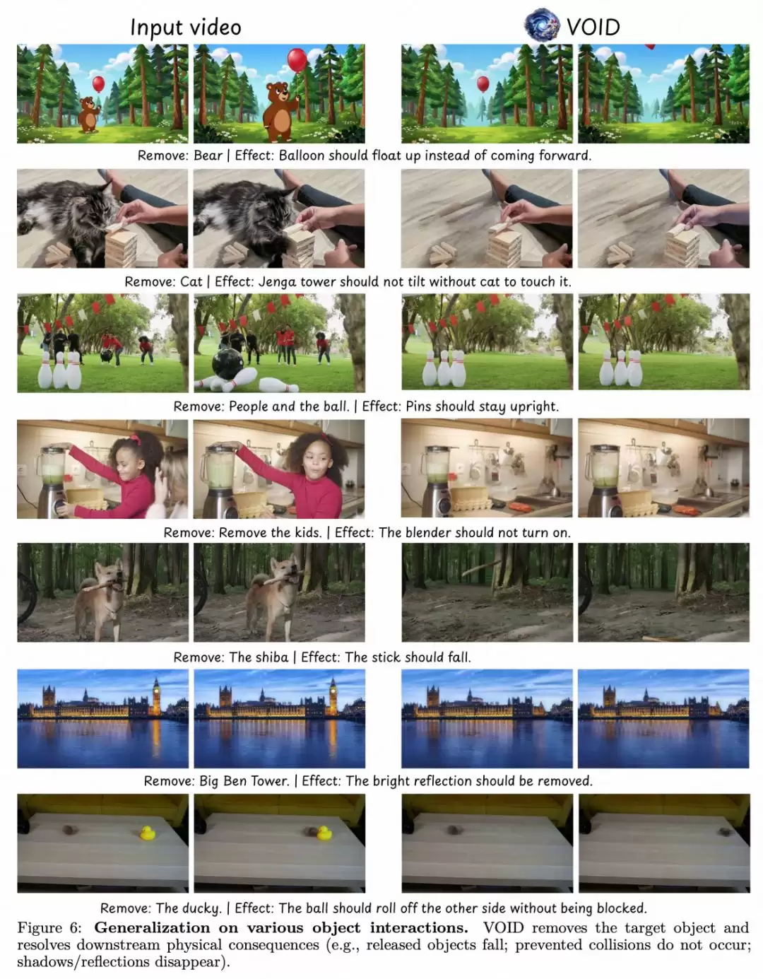 对未见效果的泛化: 在泛化能力测试中,VOID成功处理了多种训练时未曾见过的交互类型。例如:移除拿着气球的卡通熊后,气球会向上飘走;移除按下搅拌机按钮的孩子后,搅拌机保持未启动状态;移除正在咬住棍子的狗后,棍子自然掉落;以及移除作为障碍物的橡皮鸭后,小球的滚动轨迹随之改变。
