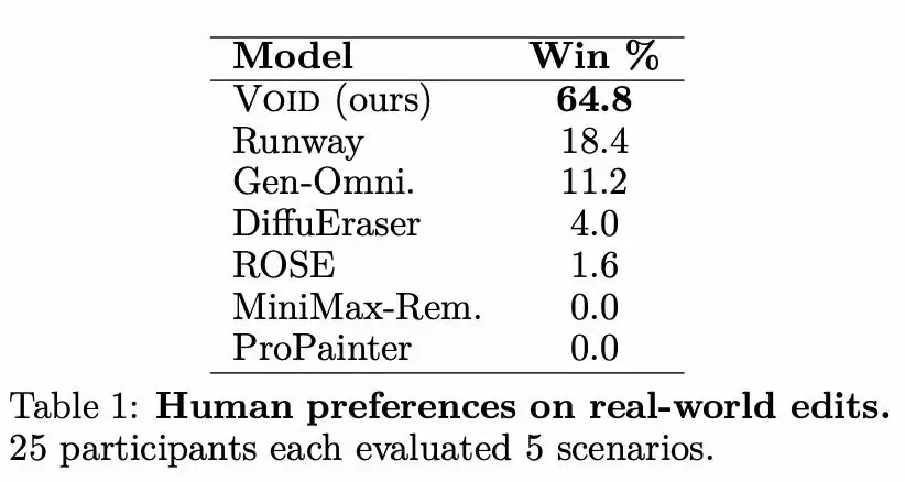 人类偏好研究: 25名参与者每人评估5个不同场景,从7个模型的输出中挑选最佳结果。数据显示,VOID以64.8%的胜率稳居第一,达到SOTA水平。值得注意的是,即使竞争对手Runway额外接受了描述预期场景变化的文本指令,仍未能撼动VOID的优势。