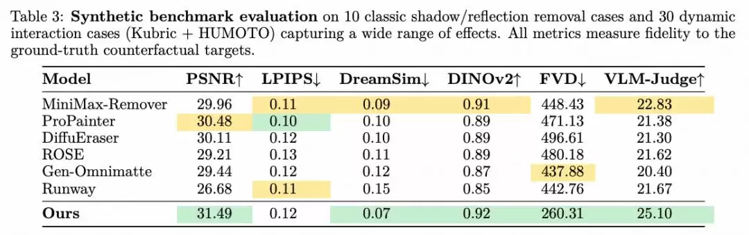 在一个包含10个经典影子/倒影移除案例和30个动态交互案例的合成基准测试上,VOID同样展现了SOTA级别的能力。