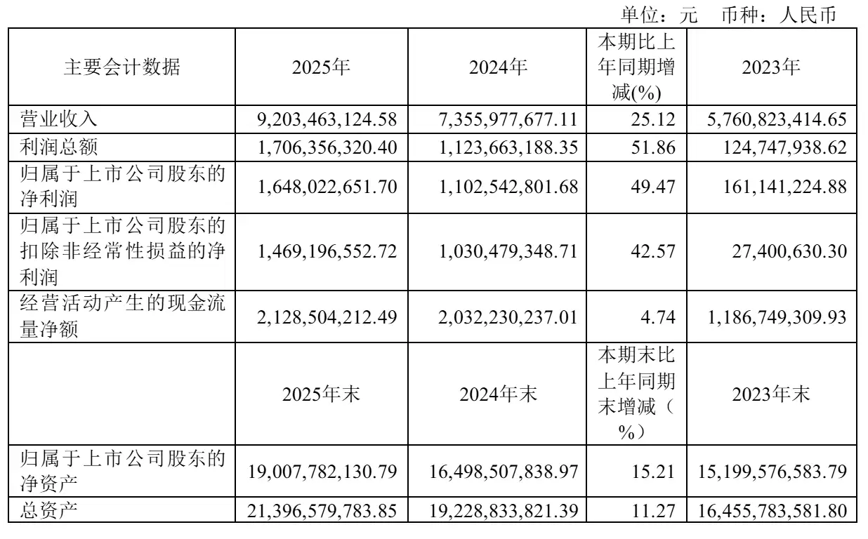 盈利能力的跃升是本次财报更关键的看点。2025年,公司净利润达到16.48亿元,同比大幅增长49.47%。扣除非经常性损益后的净利润为14.69亿元,同比增幅亦高达42.57%。利润增速显著超越营收增速,这一财务特征明确指向公司产品结构优化、成本控制能力增强以及整体运营效率的实质性提升。