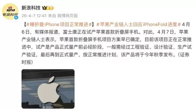 然而,产业链的最新动态提供了另一视角。新浪科技后续消息援引苹果供应链人士观点,指出首款折叠屏手机的项目方案实际早已定型,目前正严格遵循产品验证流程推进。试产是量产前不可或缺的环节,涵盖工程验证测试、设计验证测试及生产验证测试等多个阶段。按现有进度评估,该产品仍有较高概率锁定今年秋季的发布窗口。