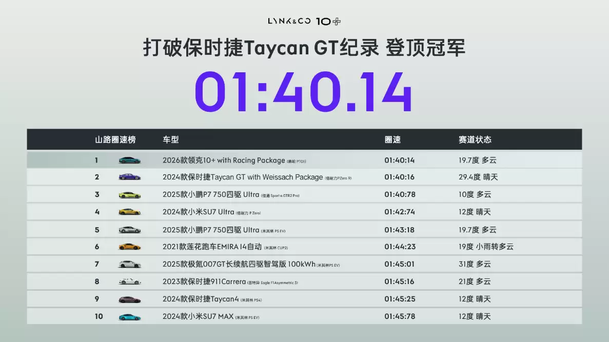 数据是性能的量化,赛道则是性能的终极验证场。领克此次的发布策略极为硬核。作为品牌首款以“+”命名的极致运动座驾,领克10+经由领克汽车运动部门进行赛道级调校并搭载专属性能套件后,在亚洲山脊赛道上创下了1分40秒14的圈速记录,超越了保时捷Taycan GT,成功加冕“弯道之王”。这一成绩,清晰地印证了领克在纯电运动操控领域的领先地位。