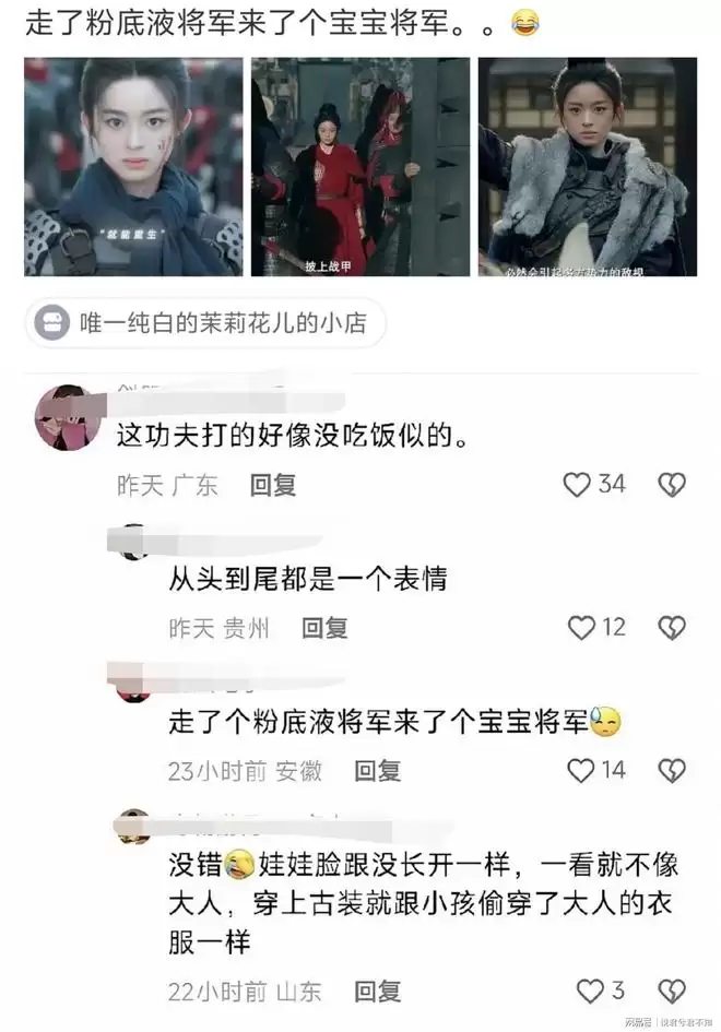 近期剧中“粉底液将军”的造型争议再次发酵。妆容细节被反复讨论,甚至衍生出“宝宝将军”这类消解角色严肃性的调侃,主演黄杨钿甜的观众缘与角色可信度遭受连带冲击。负面舆情一旦形成传播惯性,便很难在短期内扭转。