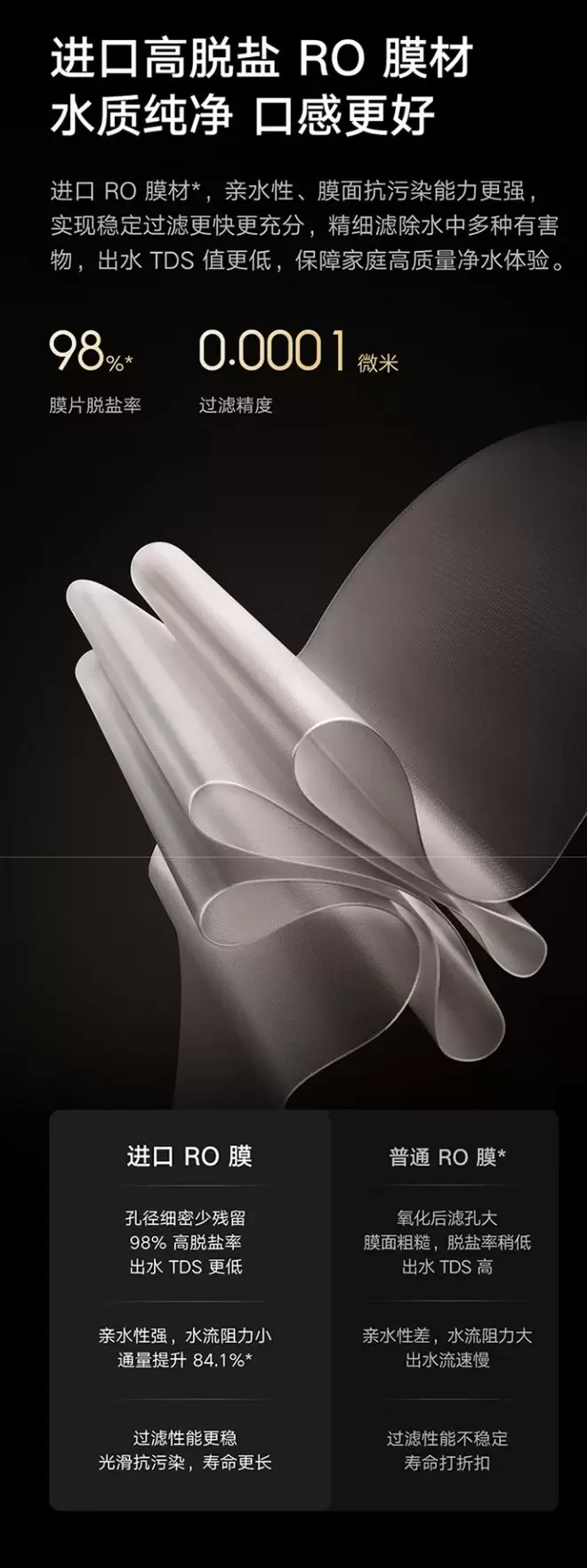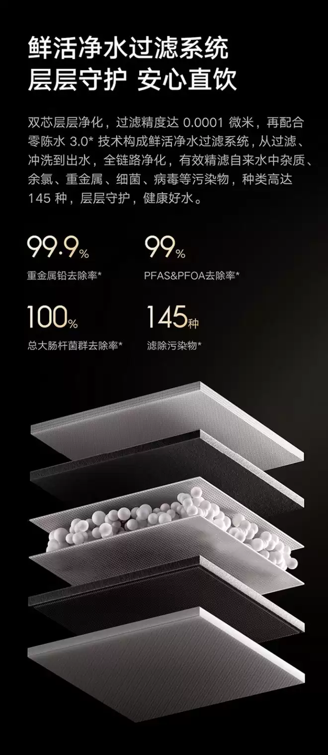 产品性能的核心在于其过滤精度。官方数据显示,其过滤系统可达到0.0001微米级别,能有效拦截细菌、病毒等微生物。具体而言,其宣称可滤除高达145种污染物,对重金属铅的去除率宣称达99.9%,对PFAS/PFOA等持久性有机污染物的去除率同样达到99%。这一效能得益于其采用的进口高脱盐率RO膜,该膜材具备优异的亲水性与抗污染特性,旨在确保出水TDS值稳定在低水平,从而保障家庭饮水的纯净度与一致性。
