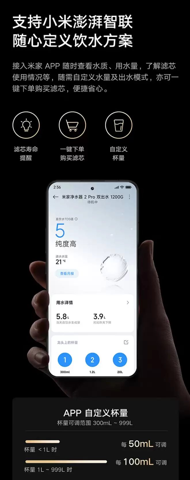为延长核心RO膜寿命,产品配备了超长直径的PPC复合滤芯进行前置保护。在智能管理层面,它支持小米澎湃智联,用户可通过专属App实时监测水质TDS、查看用水日志,并自定义出水量与出水模式,实现对净水系统的精细化、可视化管控。