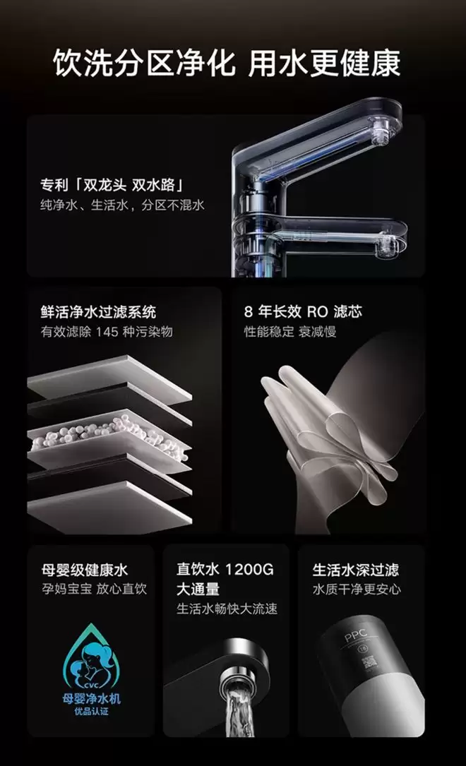 在关键规格上,RO滤芯的宣称使用寿命长达8年,期间可制取约29.2吨纯水,这显著降低了长期使用的滤芯更换频率与维护成本。1200G与1600G的大通量设计,足以应对多人口家庭的瞬时高峰用水需求。其标志性的“双龙头、双水路”架构实现了精准用水:上方龙头产出符合母婴适用标准的直饮纯净水,可用于直接饮用或冲泡奶粉;下方龙头则供应经过前置过滤的生活用水,适用于淘米、洗菜等厨房清洁,避免了高纯度水资源的非必要消耗。两条水路物理隔离,彻底杜绝了交叉污染的风险。