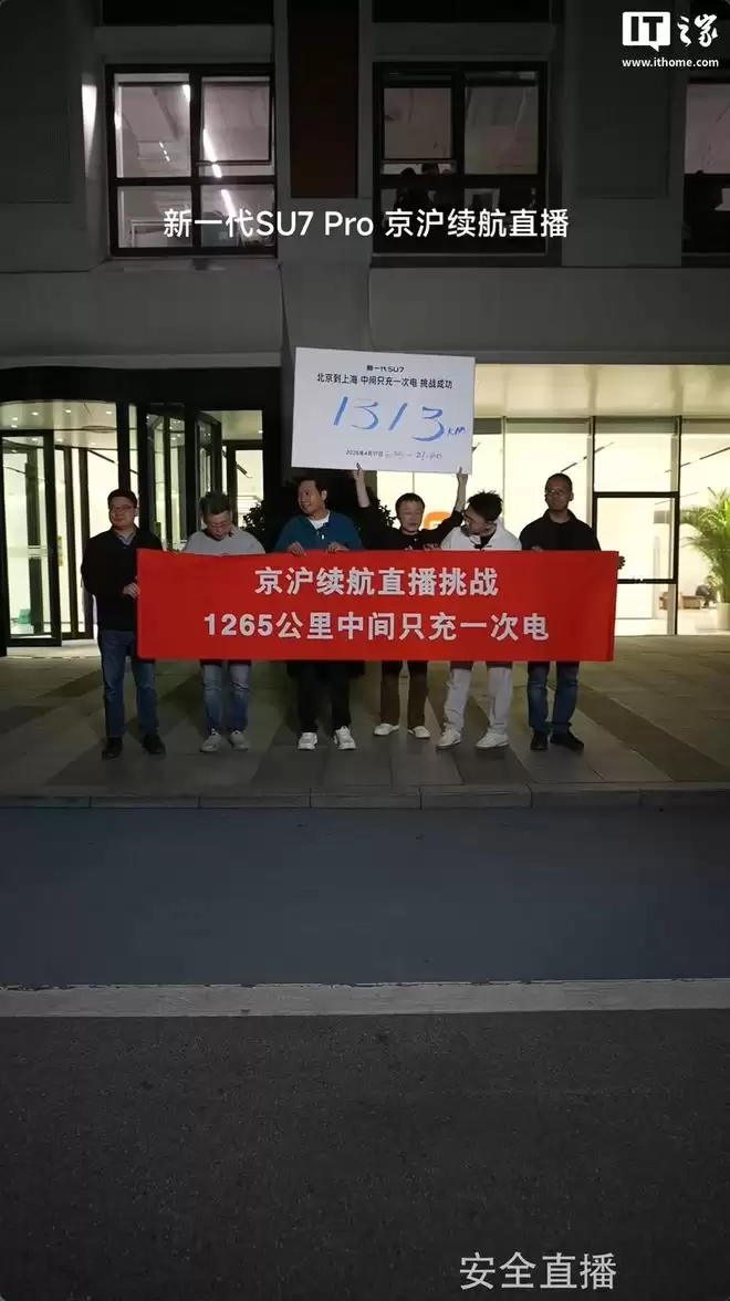 21:40,车队最终抵达上海金桥的小米5G未来中心工区。最终数据定格:总行驶时间15小时,总里程1313公里,此时表显剩余续航里程为19公里。“满电出发,中途仅充一次电直达上海”的公开挑战目标,至此成功达成。