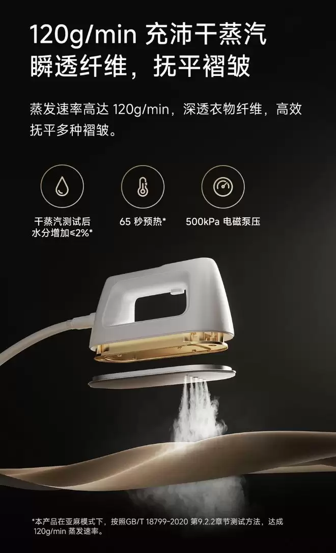 在核心熨烫性能上,米家熨烫机2专注于高效蒸汽输出。其预热效率突出,仅需65秒即可进入工作状态。蒸汽发生速率达到120克/分钟,配合500kPa高压电磁泵,确保了蒸汽具备出色的穿透力与持续性。