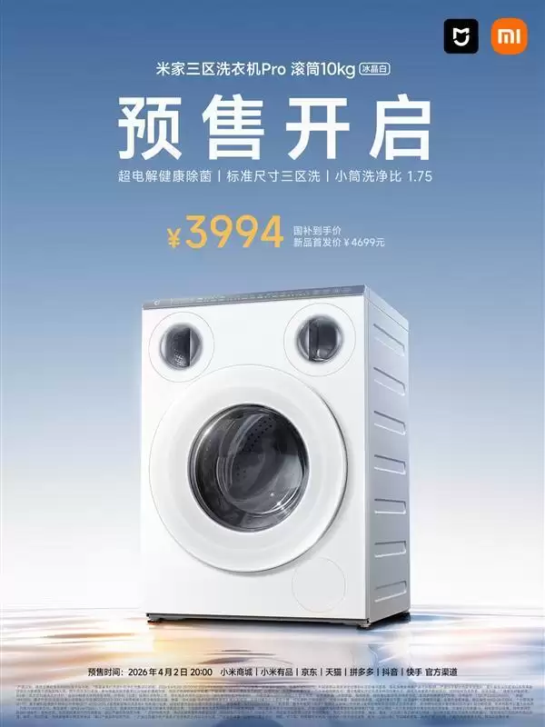 米家三区洗衣机Pro冰晶白发布:三筒独立洗护,白色外观适配多元家居场景 去年,米家三