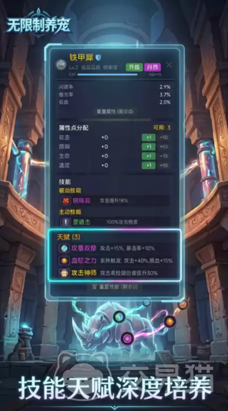 如果说宠物是棋子,那么技能系统就是让棋子活起来的棋谱。游戏构建了一个清晰的三层成长维度:主动技能直接决定了回合节奏与关键输出窗口;天赋系统则提供了超过一百条差异化的成长路径,让同一种宠物也能走出不同风格;而被动技能,更是支持跨角色协同叠加的精妙设计。关键在于,这三类技能模块是完全解耦的。玩家可以在百余种被动效果中自由组合搭配,从而形成像“高速连击流”、“反伤反击流”、“元素连锁流”这样已经过验证的数十种成熟流派。当然,你也可以抛开攻略,尝试那些尚未被广泛验证的创新配装方案,探索的乐趣正在于此。