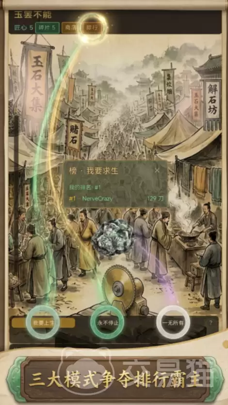 游戏精心设计了三种挑战模式,机制分明且难度层层递进。“我要上岸”是入门导向的关卡模式,要求玩家连续成功切割8次即可通关,而用刀次数越少,最终排名就越靠前,鼓励精准操作。“永不休止”则是经典的无尽模式,你需要不断切石,积累特定数值,这个数值将直接关联全球排行榜的实时名次,竞争激烈。至于“一无所有”模式,堪称对心理素质的终极考验——高风险带来高回报,但一旦操作失误,所有历史成绩将瞬间归零,对玩家的临场判断和抗压能力提出了极致要求。