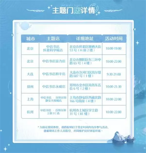 为了方便各地玩家参与,这次联动在五个城市的核心商圈一共布置了六家主题门店。各家店的营业时间不尽相同,基本从白天覆盖到晚间。给个贴心提示:如果你打算前往,最好提前确认一下心仪门店的具体营业时间,免得白跑一趟。