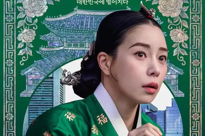 SBS新剧海报的第一眼冲击力极强:现代都市的景观中,赫然“嵌入”了一幅完整的古装人物画。林智妍饰演的朝鲜时代恶女姜丹心,被精准地“封装”在传统螺钿屏风的边框之内,这种视觉上的强行并置,营造出一种数字合成般的错位感,仿佛角色是被硬生生拽入了2025年的首尔。