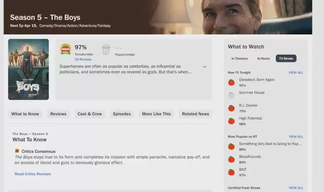 备受期待的《黑袍纠察队》第五季,也就是整个系列的最终章,媒体口碑终于出炉了。结果如何?用一个词概括:炸裂。目前,该季在烂番茄上的新鲜度稳居97%的高位,这可是基于超过30条专业媒体评价得出的成绩单。