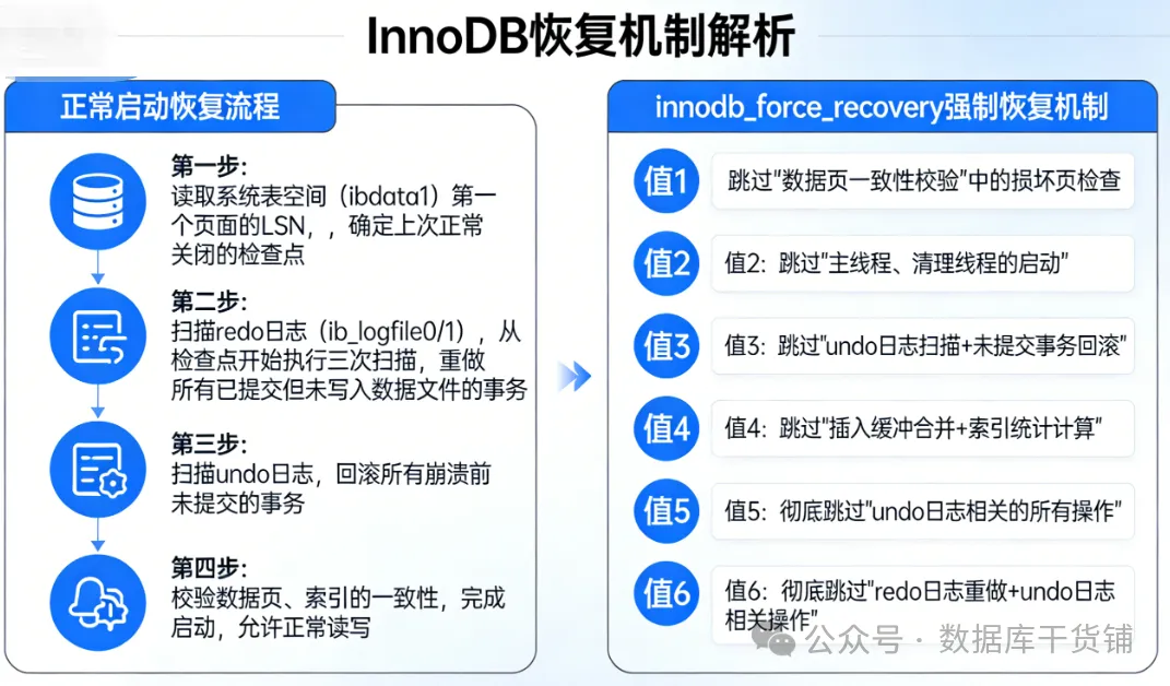 理解 InnoDB 的恢复机制,能帮助你更灵活地运用此参数,而非机械记忆。以下是 InnoDB 正常的启动恢复流程: