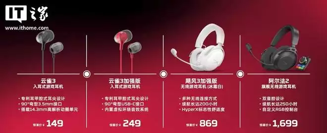 接下来是头戴式的飓风3系列。这次更新主要带来了新配色:标准版新增了“脉冲蓝”,而加强版则新增了“冰霜白”配色。
