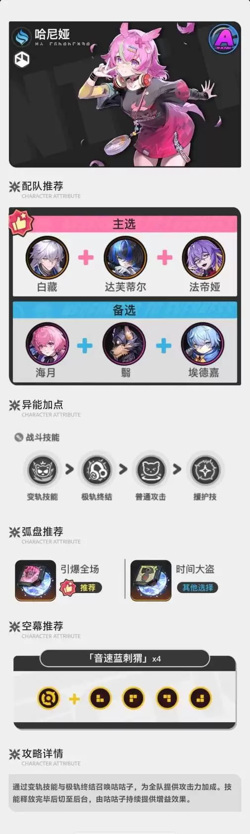 先得搞清楚哈尼娅在队伍里是干嘛的。她的技能组设计得很明确,就是围绕着“高频攻击”与“状态叠加”来做文章。普通攻击的段数多,战技冷却时间也短,这意味着她是个典型的持续输出手,而不是那种打一波爆发的类型。所以,配装和配队的核心思路,就得顺着这个特性来:如何让她打得更久、叠得更快、伤害刮得更疼。