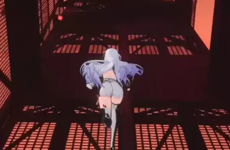 成功跳过裂隙后,向上攀爬,来到一个铁架的顶端。站稳后,需要做一个反向跳跃,目标是跳到外侧那根孤零零的悬空钢管上。