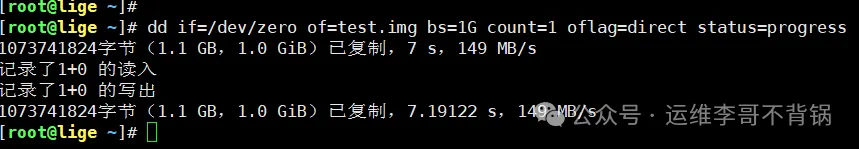 该命令会向磁盘写入一个1GB的测试文件。关键参数oflag=direct指示系统绕过页面缓存,直接进行物理写入。最终输出的吞吐量数据,反映了磁盘在无缓存干扰下的真实顺序写入性能。这是诊断存储延迟或带宽问题的快速有效方法。