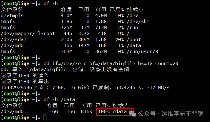 上述命令将在/data目录下立即生成一个20GB的填充文件。相较于fallocate等快速创建稀疏文件的方法,dd会实际占用物理存储空间(写入零值),更真实地模拟磁盘使用率饱和的状态。