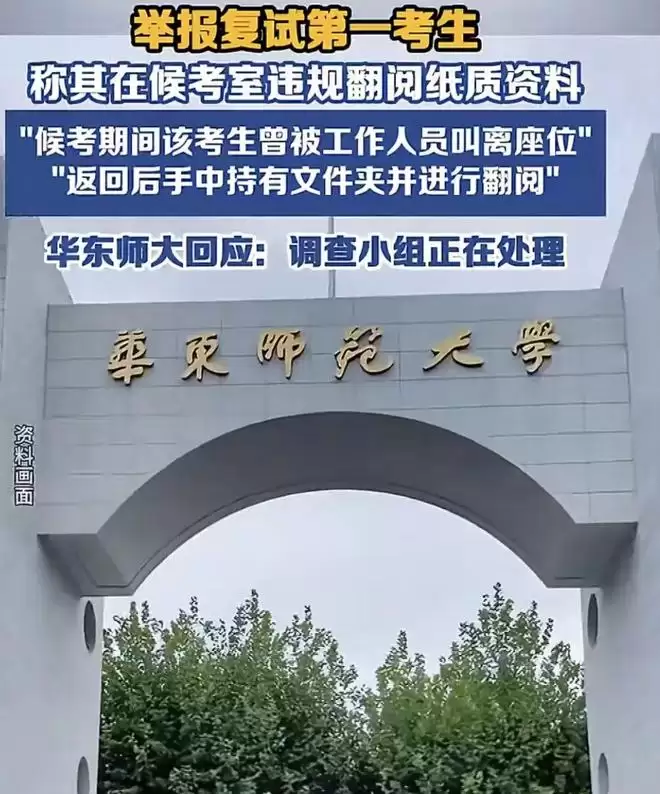 华东师范大学2026年硕士复试近期引发争议。一名39岁的落榜考生实名举报,称综合成绩排名第一的考生在候考室违规翻阅纸质材料。根据现场明确规定,任何与复试相关的资料不得带入候考室。有多位在场考生证实目睹了该行为。校方研究生招生办已回应,称专项调查组已介入,审查程序正在进行。