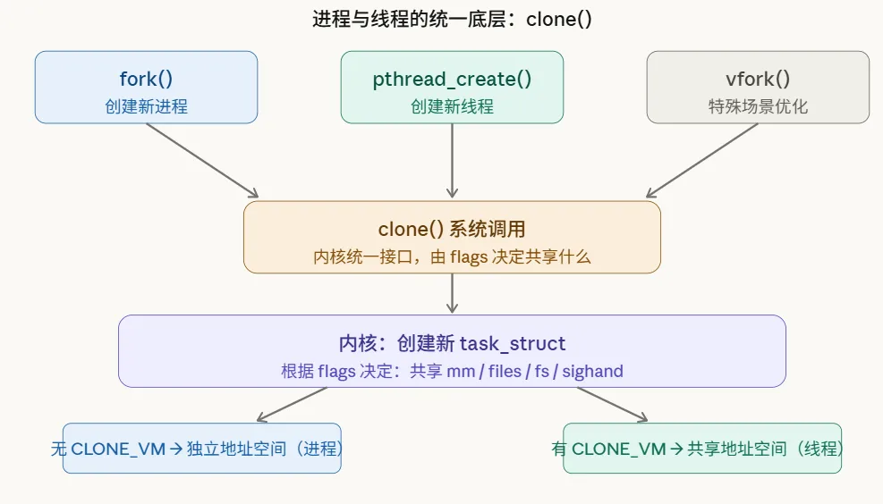Linux创建线程和创建进程,使用同一个底层系统调用——clone()。区别仅在于传入的标志位(flags)不同: