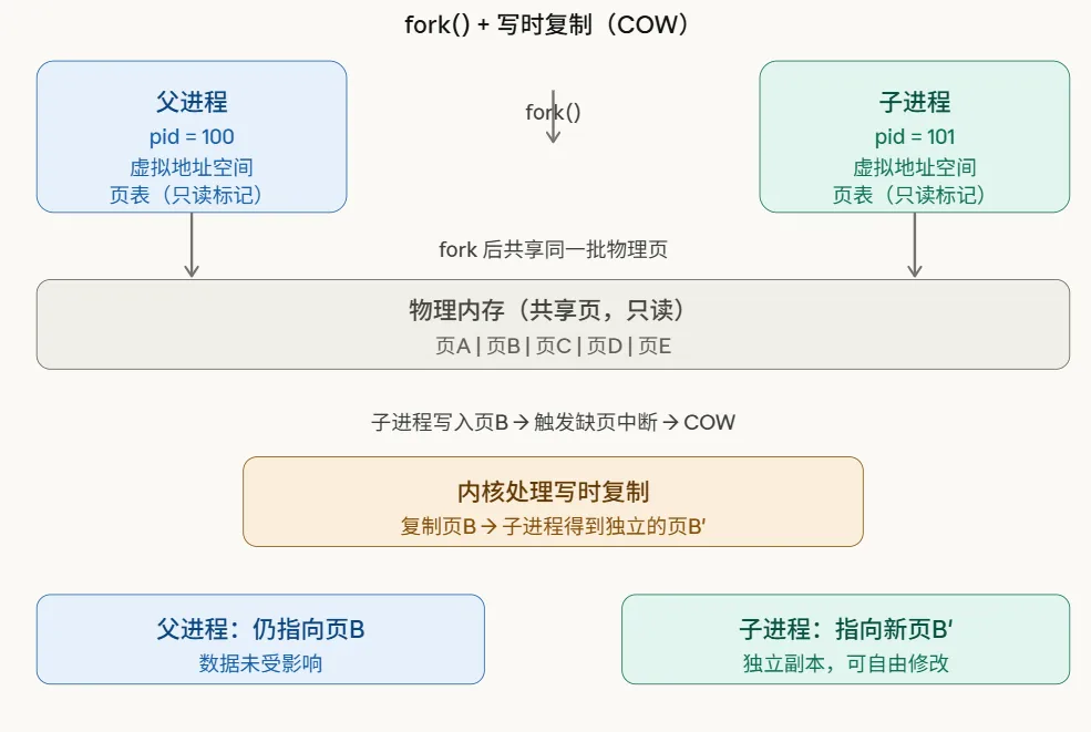 fork() 调用后,父子进程共享相同的物理内存页,内核仅将这些页的页表项标记为“只读”。当任一进程尝试写入共享页时,会触发缺页异常,内核此时才真正复制该页给写入进程。这就是“按需复制”。