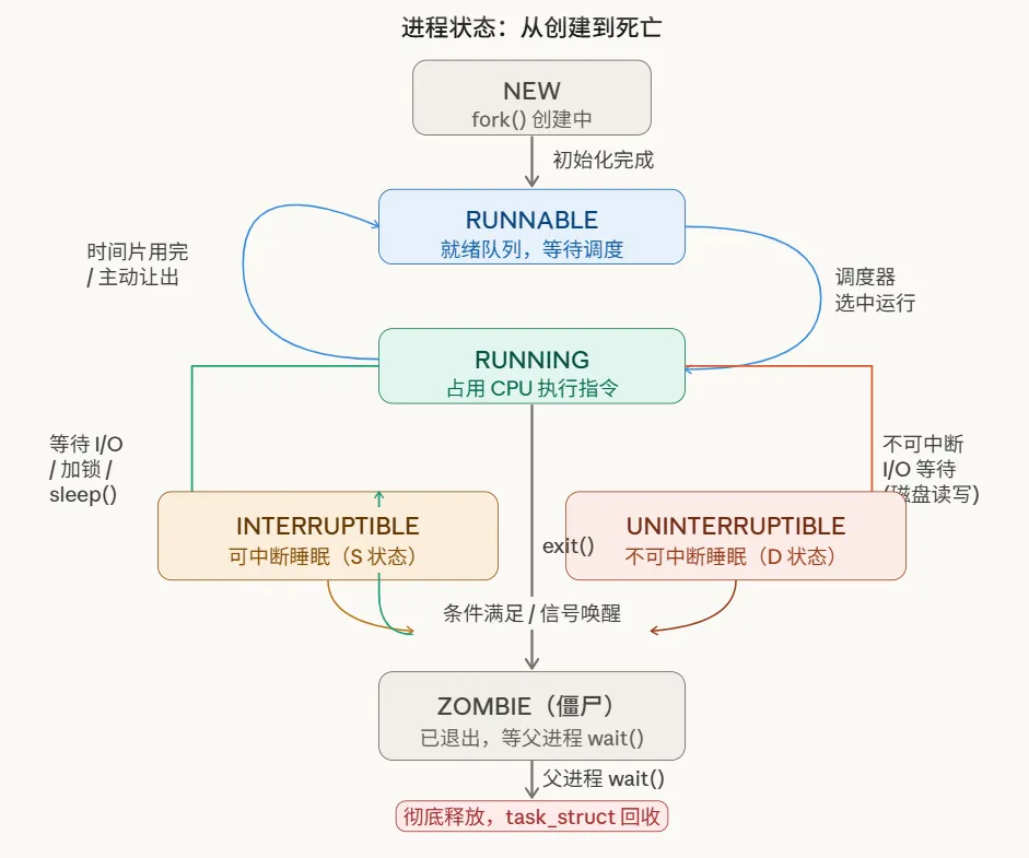 ps 命令看到的大部分睡眠进程处于此状态,它们可以被信号唤醒。kill -9 都无法终止它。典型的案例是NFS网络文件系统挂起导致的进程“卡死”。这里重点说明僵尸进程(Zombie)。子进程退出后,其 task_struct 不会立即释放,而是等待父进程调用 wait() 或 waitpid() 来收集其退出状态。如果父进程一直不调用 wait(),子进程将保持僵尸状态。僵尸进程虽不消耗内存,但会占用有限的PID资源,积累过多可能导致无法创建新进程。