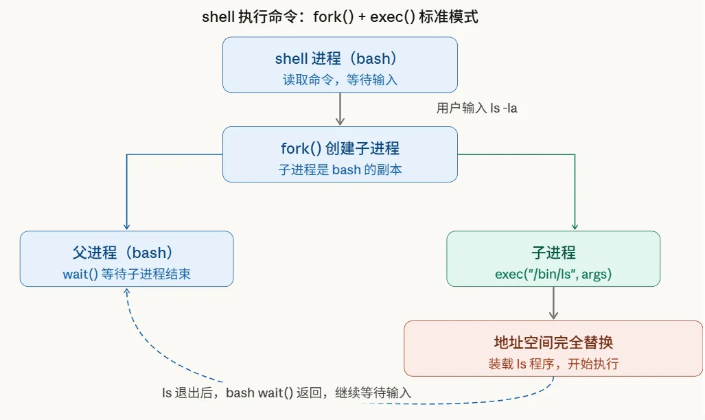 fork() + exec() 是Shell执行命令的标准模式,其完整流程如下:
