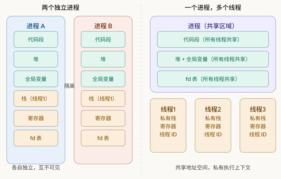 如图所示:进程之间完全隔离,各自拥有独立的代码、堆、栈和文件描述符表。而同一进程内的多个线程,则共享代码段、堆、全局变量和文件描述符表,每个线程私有的只有自己的栈、寄存器和线程ID。