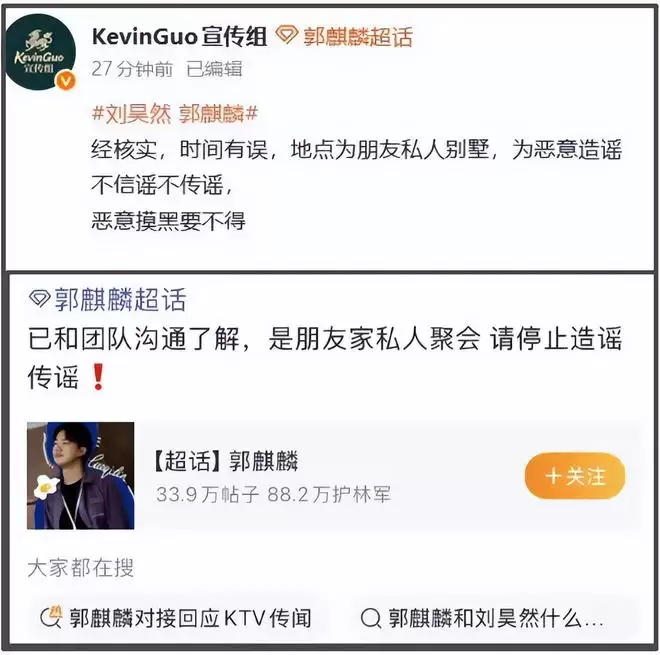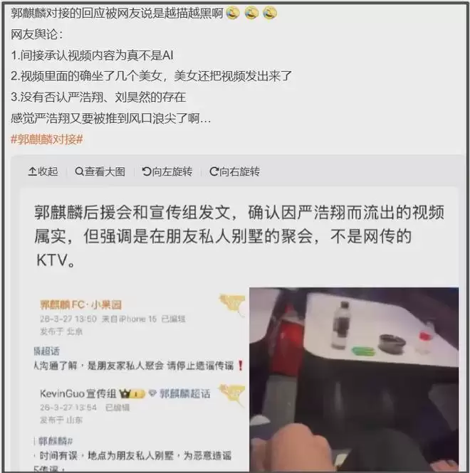郭麒麟方面确认画面中男子为本人,但强调地点是朋友私人别墅,而非商K。刘昊然后援会同样认可画面真实性,并坚决否认刘昊然曾进入网传的商K场合。